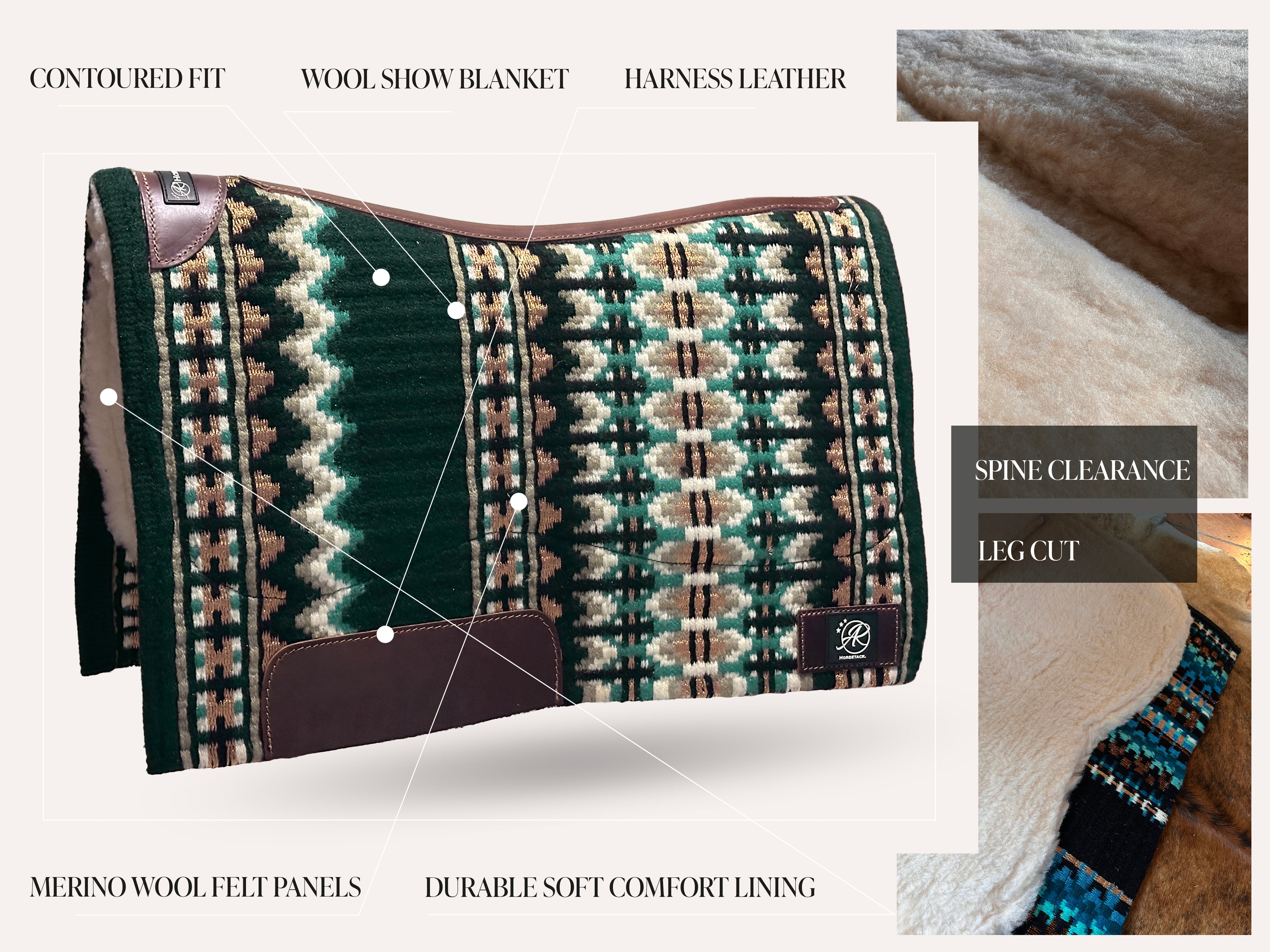 One pad that combines everything: the look of a luxurious show blanket and the high-quality comfort of an anatomically shaped Merino wool pad.